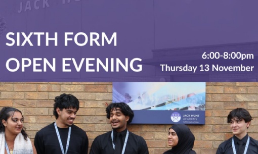 Jack Hunt Academy are holding their annual Sixth Form Open Evening on Thursday 13 November 2025. We would like to extend a warm invitation to you and your child to come along and find out about being a sixth form student at Jack Hunt Academy and the opportunities we offer.