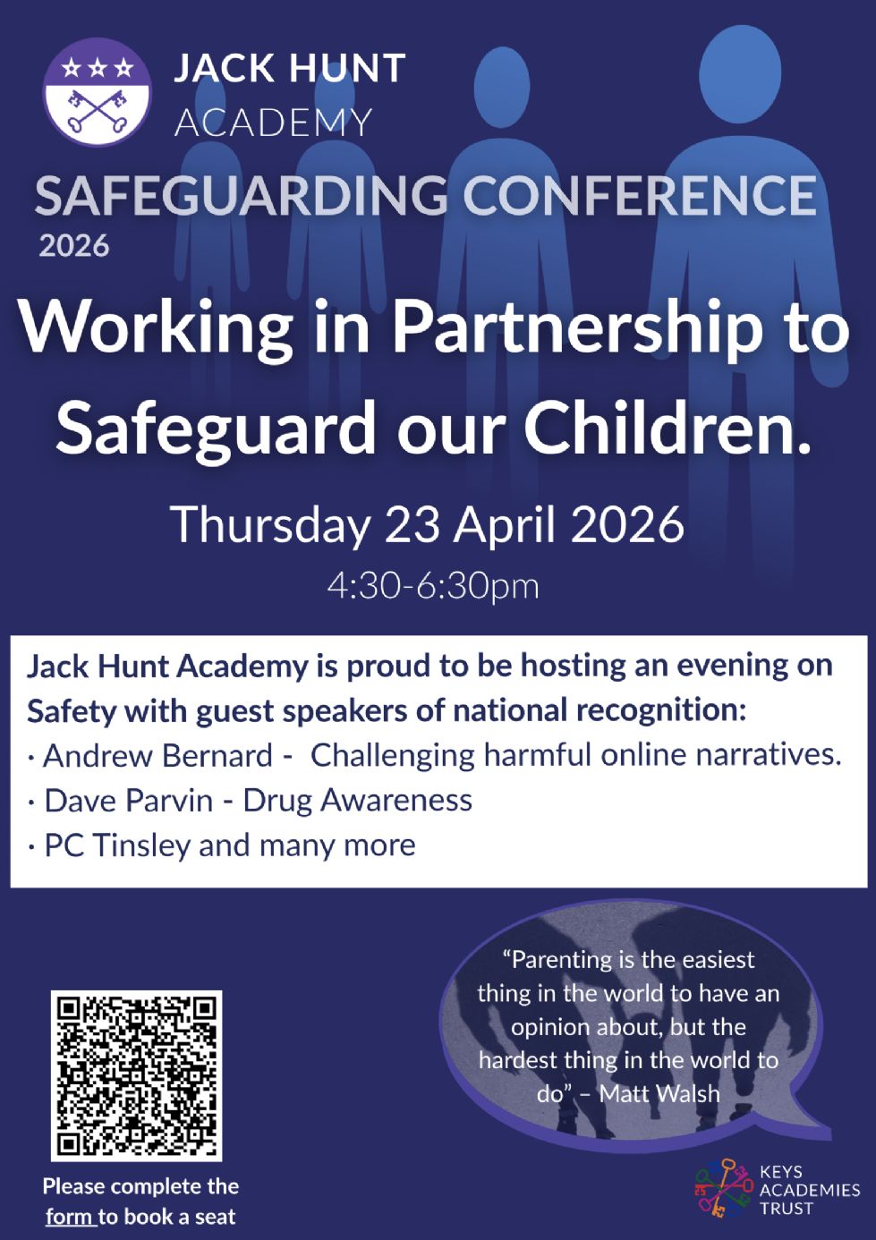 Jack Hunt Academy is pleased to invite parents and carers to an upcoming Safeguarding Conference titled “Working in Partnership to Safeguard Our Children”, taking place on Thursday 23rd April 2026