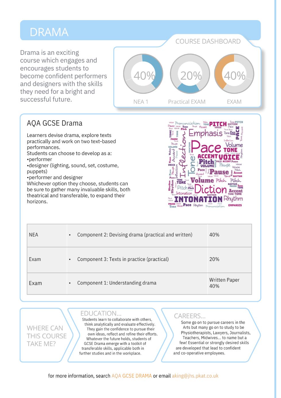 • Some of the topics which are covered include: Play scripts, Shakespeare, Commedia Dell’Arte, Physical Theatre, bullying, justice, live theatre and a variety of play texts to link with GCSE and A level study.