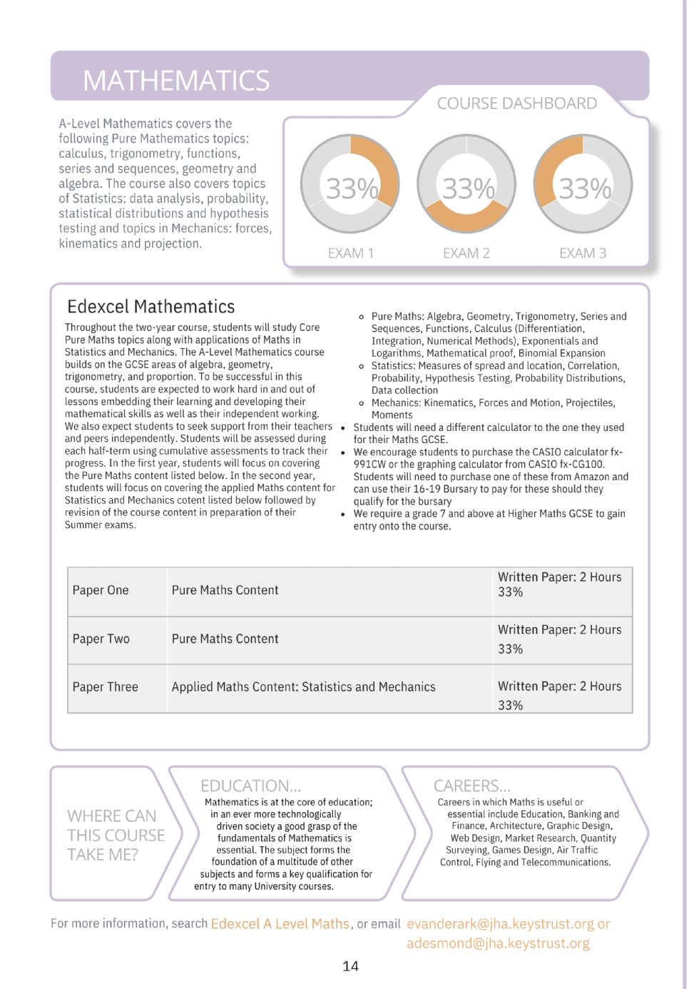 At the end of KS5, a JHA Maths student will be able to have built significantly on their GCSE Higher Maths knowledge and confidently apply foundational A Level Maths knowledge to procedural questions. They will then be able to confidently complete modelling questions indicating their higher A Level Maths knowledge. They will be equipped to extend their Mathematical knowledge further as undergraduates or to apply their advanced knowledge to their chosen careers.